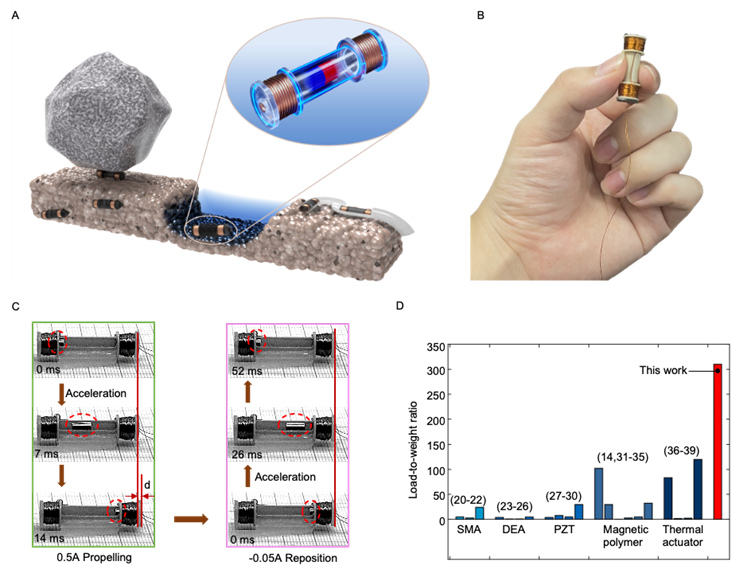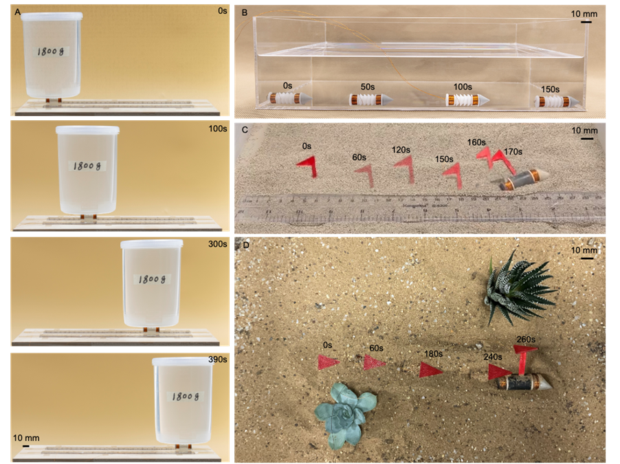 This microrobot features a compact design (∅12 mm × 32 mm), with a plastic shell, a cylindrical NdFeB permanent magnet embedded in the central channel, and dual electromagnetic coil arrays symmetrically arranged at both ends. Under 0.5 A current drive, internal magnetic interactions accelerate the permanent magnet to 2.10 m/s within 17 ms, striking the end wall to generate powerful instantaneous thrust, propelling the robot via the principle of momentum conservation. Experiments show that the new microrobot can smoothly advance in viscous oil, traverse sand and granular media, while demonstrating potential for entering confined pipeline environments. Additionally, the team has overcome challenges in efficient steering control and vision-free positioning for the robot, providing a new paradigm for innovation in miniature robot drive technology. The results are expected to enable scaled applications in confined space operation scenarios with stringent output force requirements.